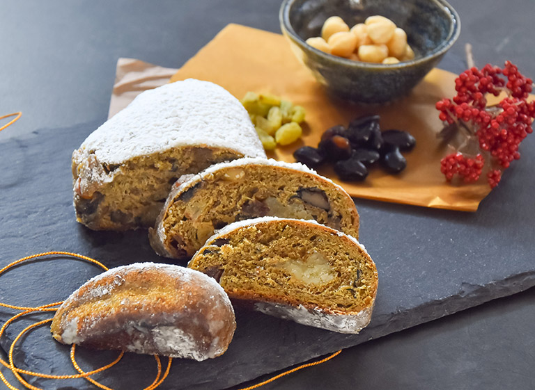 ナチュールでは、ドライフルーツをたっぷり練り込んだ「フルーツのシュトーレン」と
